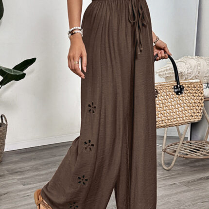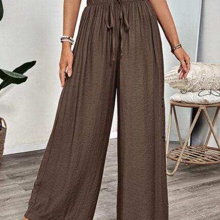 Simple style lace-up embroidered solid color loose wide-leg pants