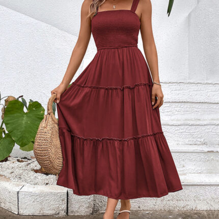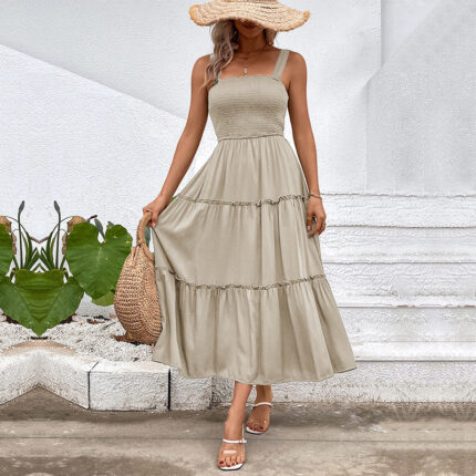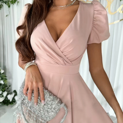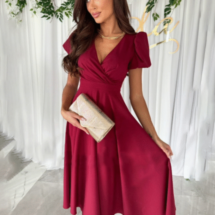 New Commuting Solid Color V-Neck Waist Puff Sleeve Swing Dress