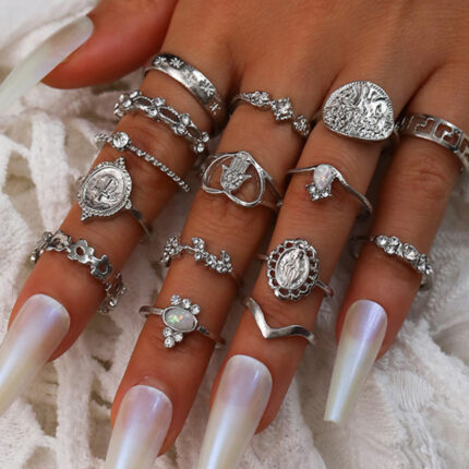 Retro Beauty Head Portrait Gold Coin Cross Pattern Love Fatima Palm Ring 15-piece Ring Set