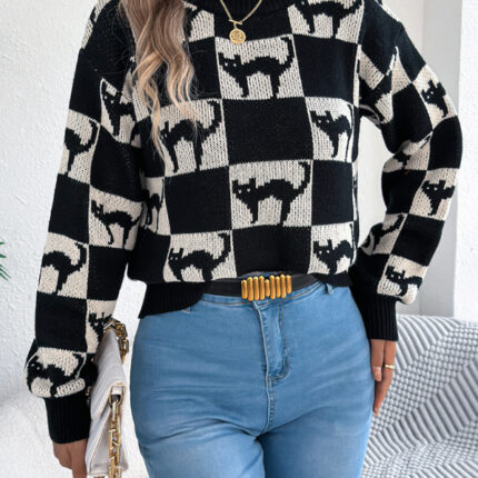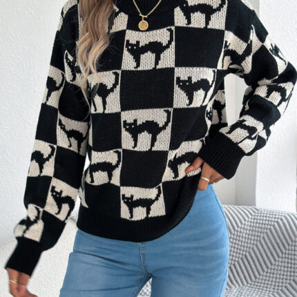 Halloween Plaid Cat Long Sleeve Pullover Sweater