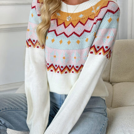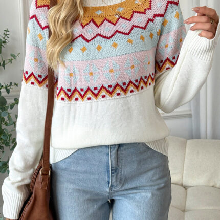 Casual loose contrast jacquard long-sleeved crew neck sweater