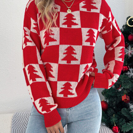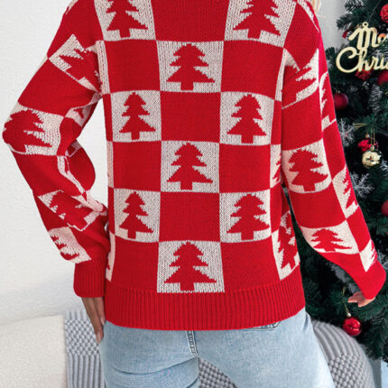 Christmas Tree Plaid Lantern Long Sleeve Pullover Sweater