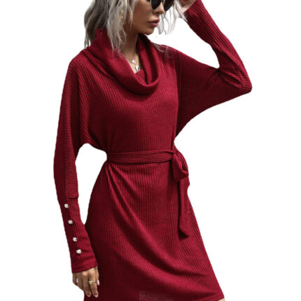 New pile collar solid color bottoming knitted sweater dress with long sleeves