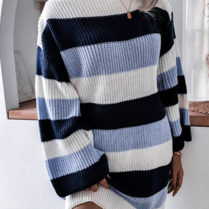 Women’s straight neck off shoulder loose contrast striped knitted wool dress