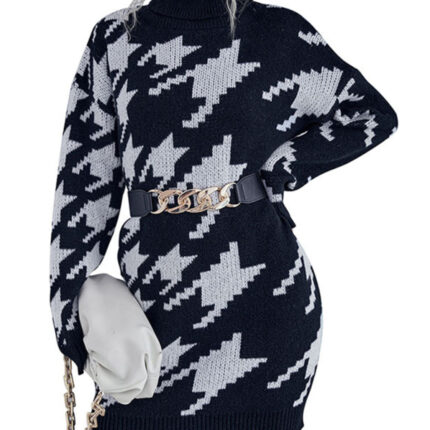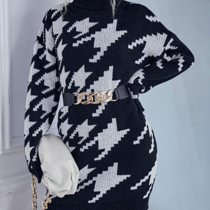 Women’s turtleneck loose long sleeve houndstooth sweater dress