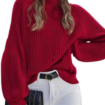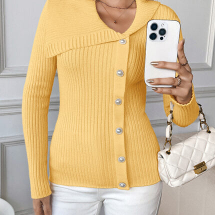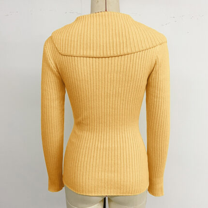 Pearl embellished solid color asymmetrical V-neck slim-fit sweater
