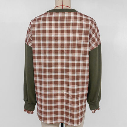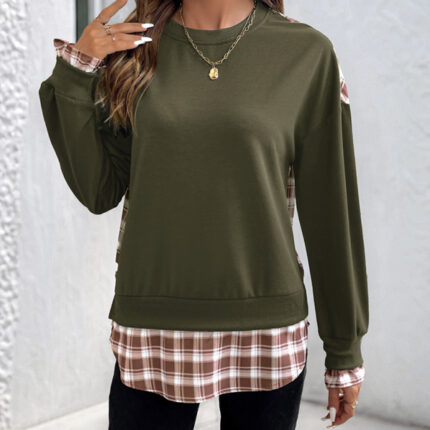 New Thin Plaid Stitching Round Neck Pullover Sweatshirt