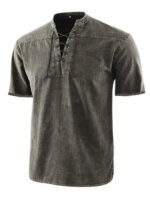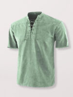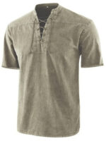 Men’s Woven Retro Lace Up Collar Casual Short Sleeve Shirt