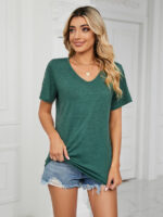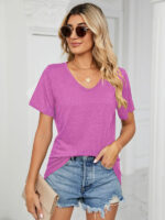 Short Sleeve V Neck Gathered Solid Color Loose T-Shirt Top Ladies