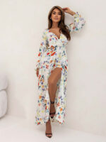 Women’s Printed V-Neck Sexy Slit Long Sleeve Dress